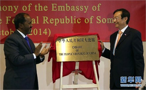 10月12日,在索马里首都摩加迪沙,索马里总统哈桑·谢赫·马哈茂德(左)和中国外交部副部长张明在复馆仪式上为大使馆揭牌