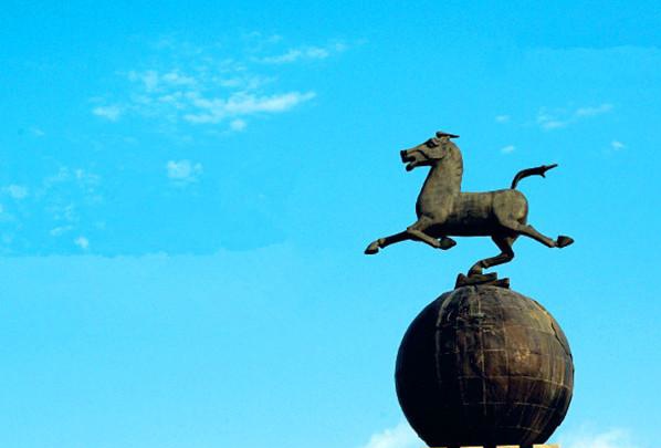 图为古丝绸之路重镇甘肃省嘉峪关市的“马踏飞燕”雕塑