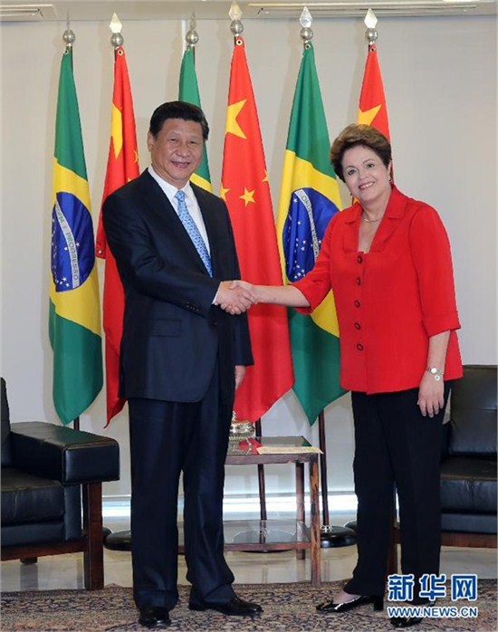 巴西总统罗塞夫迎接习近平 各位同事! 中国正在全面深化改革,发挥市场在资源配置中的决定性作用,更好发挥政府作用,努力建设开放型经济新体制。2013年,中国成为全球128个国家的最大贸易伙伴,年货物进口额接近2万亿美元,对外非金融类投资超过900亿美元,出境旅游近1亿人次。这些数字还在扩大,将为世界经济增长创造更多需求和机会。 中国外交有原则、重情谊、讲道义、谋公正。对大国关系,中国主张不冲突不对抗、相互尊重、合作共赢,共同走和平发展之路。对金砖国家合作,我们尤为珍视,列为外交优先领域,坚持同金砖国家做好朋友、好兄弟、好伙伴。 我相信,一个发展质量更好、更具包容性、更可持续的中国,一个在国际关系中倡导和平、发展、合作、共赢的中国,一个积极参与金砖国家合作的中国,必将继续为维护世界和平、促进共同发展作出更大贡献。 谢谢大家。